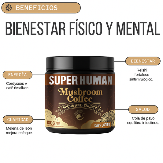SuperHuman™|Mushroom Coffee - Café Instantáneo con 6 Hongos Funcionales - Claridad Mental y Energia Sostenida